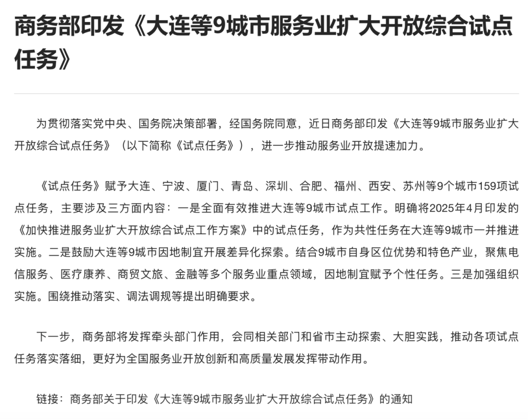 2025年4月亿策略,国务院印发《关于〈加快推进服务业扩大开放综合试点工作方案〉的批复》,明确在已有的北京等11个试点地区基础上,将大连等9个城市纳入试点范围。