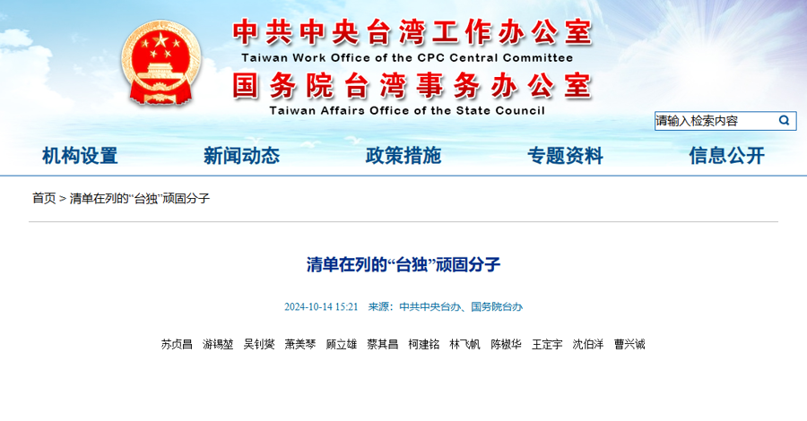 2024年10月14日,中共中央台办、国务院台办曾公布12名“台独”顽固分子,分别是:苏贞昌 游锡堃 吴钊燮 萧美琴 顾立雄 蔡其昌 柯建铭 林飞帆 陈椒华 王定宇 沈伯洋 曹兴诚。